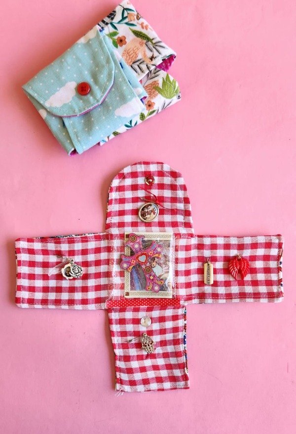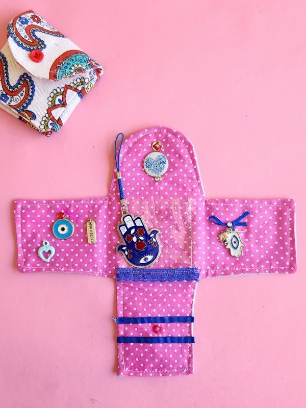 tiene un bolsillito interno transparente , varios alfileres de gancho para que puedas seguir agregando tus amuletos