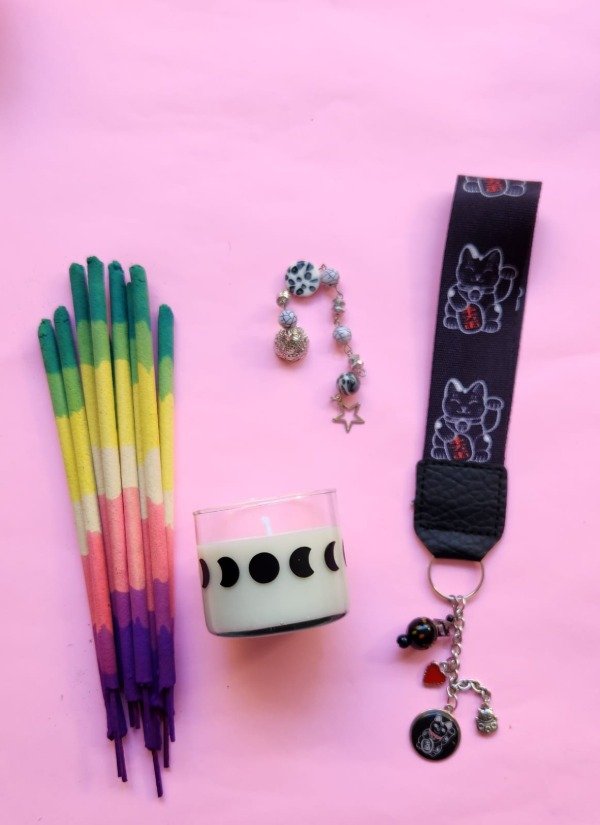 incluye: Sahumerios de colores, apagador de vela, mini vela a elección, llavero amuleto colores disponibles según stock